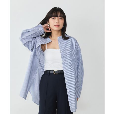 爽やかなストライプ柄が印象的な、バンドカラーシャツ。