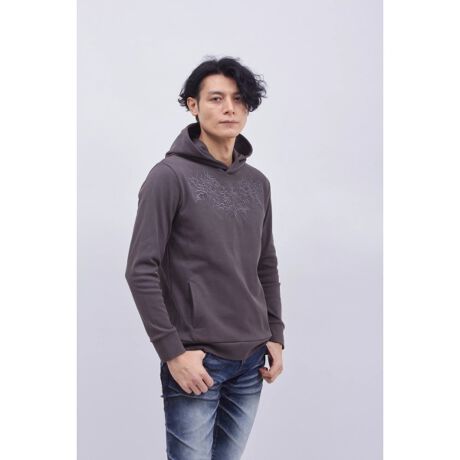 今季のテーマ性を象徴する「トライバル柄」を、フロント胸元と背面に大胆かつ緻密な刺繍で表現したプルオーバーパーカーです。