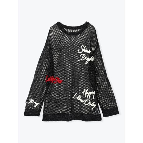[型番:26560785917]透け感のあるメッシュ編みにランダムロゴをあしらった、存在感のあるプルオーバー。インナー次第で雰囲気を変えられ、タンクトップやロゴTを重ねて大人カジュアルに。ナロースカートやデニムと合わせて、バランスの取れた着こなしもおすすめです。レイヤードを楽しみながら、スタイリングにアクセントを加えてくれる一枚です。モデル(ベージュ着用)身長:165cmMサイズ着用