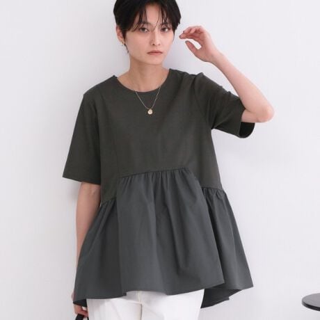 ・身頃はカットソー素材、裾はシャツ素材で切り替え、Aラインシルエットに仕上げた華やかなペプラムデザイン。