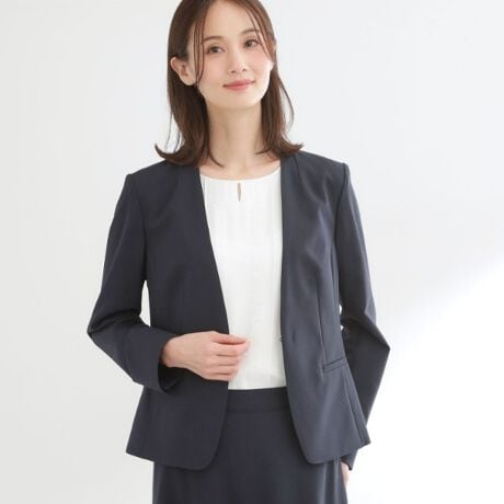 すっきりとしたシルエットが魅力のノーカラージャケット。