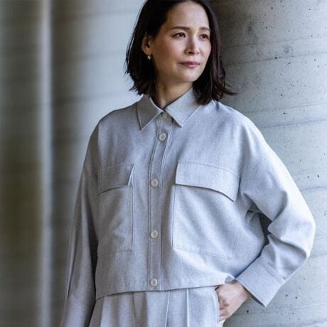 ゆったりとしたシルエットに大きめのフラップポケットを配したデザインで、ボタンはあえて大きめに設定し、全体のバランスにモダンなアクセントを加えています。