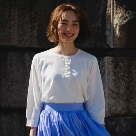 ・ニットをボトムスインでもアウトでも決まるバランス感で、スカートにもパンツにも合わせられるニットです。