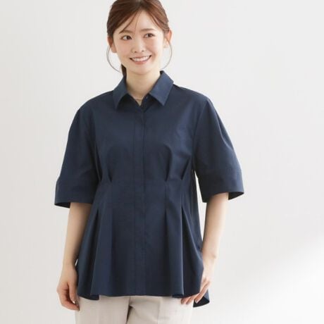 前立は比翼仕立てで羽織りとしても使えるデザインで、立体的なタック切り替えとほどよいフレア感が魅力のシャツブラウスになっています。