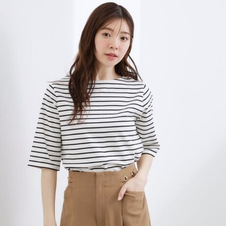 デコルテをきれいに見せてくれるボートネックで、シンプルながらも女性らしいカットソー。