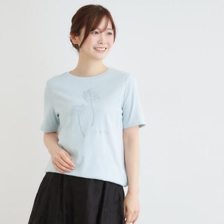 オフホワイト、サックス、ブラックの3色展開で、それぞれ同系色の刺繍を施すことで、さりげない上品さを表現。一枚で着映えするデザインです。