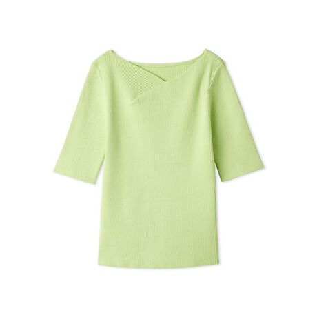 デコルテのさりげないドレープネックがデザインポイントで、一枚できちんと見えが叶うリブニットトップス。