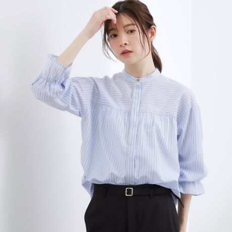 ギャザーをたっぷり入れたスタンドネックのキャンディスリーブシャツです。