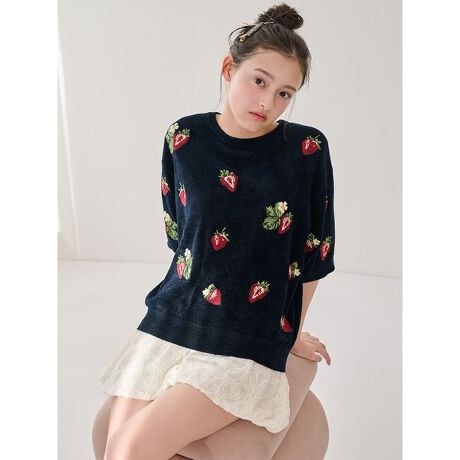 葉っぱやお花まで細かく描かれた、ジューシーないちごのジャガード刺繍を散りばめた半袖プルオーバーです。
