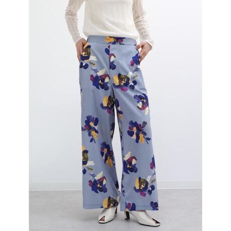 華かな配色のフラワープリントが目を惹くのワイドパンツ。色合いとペイントタッチとが相まり、まるで絵画のような奥ゆかしい印象を纏います。フロントはフラットに、バックのみゴム仕様にすることで履き心地の良さとルックスを両立。落ち感のある生地を用い筒幅のすっきりとしたシルエットに仕上げることで、どんなトップスともバランス良く着こなしが完成します。