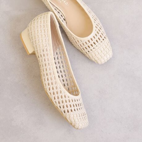 ・程よい肌見せがヘルシー、少し長めのスクエアトゥで洗練された大人の雰囲気をプラス。