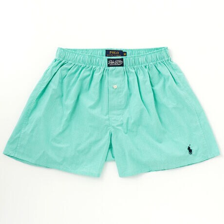 [型番:RM4-D102]コットン100%の平織生地のトランクスです。なめらかで光沢のある素材感が特長で、カーボンピーチ加工により柔らかな風合いを加えています。淡いグリーンを基調とした細かいハウンドトゥース(千鳥格子)柄。フロントセンターに縫い付けたラベルと、左裾に入れたブランドアイコンのポロプレイヤー刺繍がポイントで、ブランドロゴを刻印したボタンもさり気ないこだわりです。前開き仕様。*3Lの大きなサイズ(RM4-D102K)も展開しています。