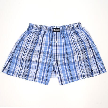 コットン100%の平織生地のトランクスです。なめらかで光沢のある素材感が特長で、カーボンピーチ加工により柔らかな風合いを加えています。淡いブルーを基調としたホワイトのラインが交差するチェック柄。フロントセンターに縫い付けたラベルと、左裾に入れたブランドアイコンのポロプレイヤー刺繍がポイントで、ブランドロゴを刻印したボタンもさり気ないこだわりです。前開き仕様。*3Lの大きなサイズ(RM4-D103K)も展開しています。