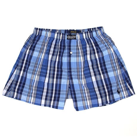 [型番:RM4-D104]コットン100%の平織生地のトランクスです。なめらかで光沢のある素材感が特長で、カーボンピーチ加工により柔らかな風合いを加えています。ブルーを基調としたクラシックなチェック柄。フロントセンターに縫い付けたラベルと、左裾に入れたブランドアイコンのポロプレイヤー刺繍もポイントです。前開き仕様。