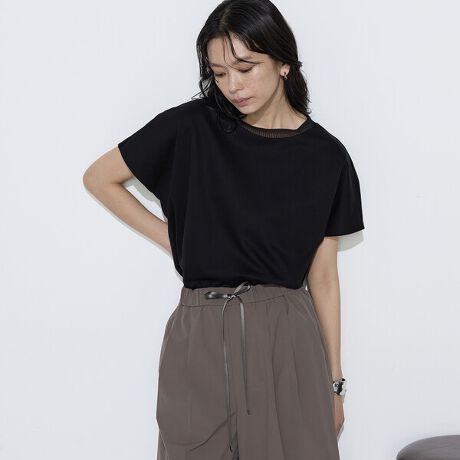 襟ぐりにシアーなニットパーツを施したシンプルな中にもアクセントがあるTシャツです。