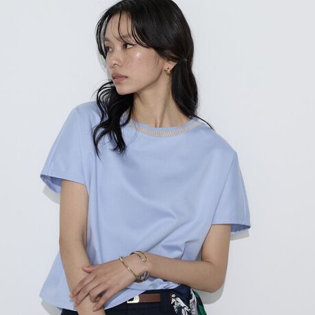 襟ぐりにシアーなニットパーツを施したシンプルな中にもアクセントがあるTシャツです。