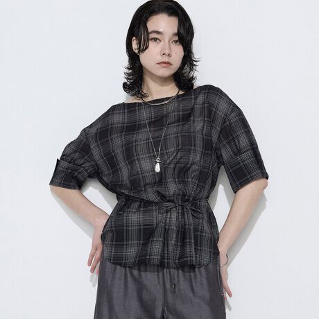 共紐リボンでウエストをマークしてもシルエットの変化を楽しめ、ウエストインするのも薄地なのですっきりと収まりおすすめです。