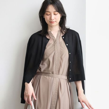 コンパクトな丈感で、ワイドパンツやフレアスカートとも好相性。ワンピースの羽織りとしてもバランスよく決まり、冷房対策にもおすすめです。シンプルなインナーにさっと羽織るだけで、軽やかなきれいめスタイルが完成します。