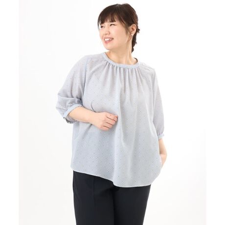 襟ぐりにはギャザーを寄せ、女性らしいやわらかな表情に。