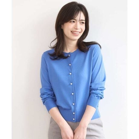 パール釦がさりげないアクセントになったコンパクトカーディガン。上品な華やかさを添えてくれるデザインで、飽きのこないシンプルさも魅力です。 ワードローブに一枚あると重宝し、どんなアイテムとも好相性に決まります。