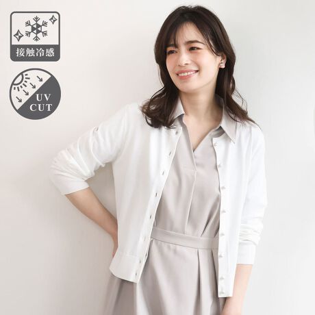 ハイゲージのきれいな目面が特徴のニット素材。お仕事などにもちょうどいい見え感でさらりとした肌触りの良さがポイント。これからの季節に嬉しい、UVカット/接触冷感機能付きです。