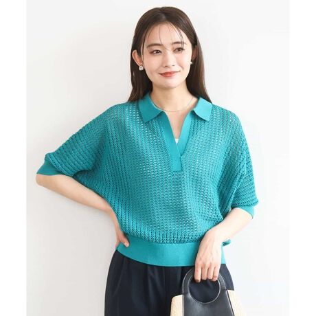 レーシーな柄編みが目をひく衿付きのニットプルオーバー。五分袖丈のドルマンスリーブで丸みのあるシルエットも大人可愛い仕上がりです。