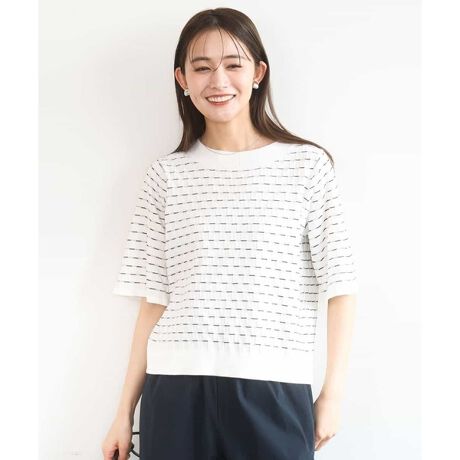 ブロック調の凹凸柄に細ボーダーラインが上品な一枚で着映えるニットトップス。太めのリブ衿と後ろ釦のディティールでお顔周りもすっきりと決まるデザインです。