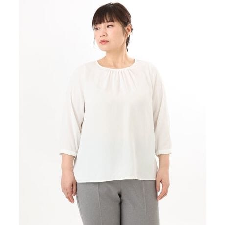 襟ぐりにはさりげなくギャザーをあしらい、顔まわりにやわらかなニュアンスをプラス。