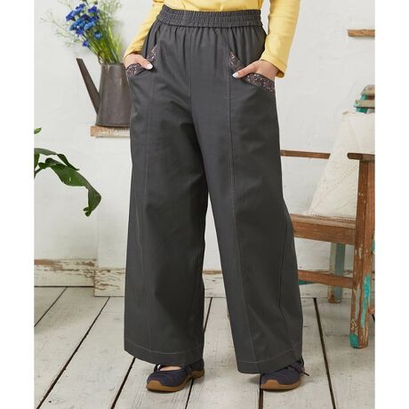 レトロな雰囲気のイージーパンツ。ほどよいワイドシルエットで体のラインを自然にカバーします。ウエストはオールゴム仕様でリラクシーな着用感を実現。前後のセンターラインに入れた切り替えと配色ステッチがポイントです。前後のポケット口に風車とお花を組み合わせた刺繍を施し、華やかな雰囲気をプラス。ベーシックで着回し力に優れた、ワードローブに揃えておきたい一枚です。