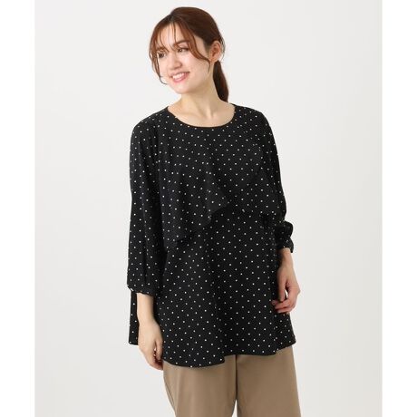 身頃に入ったフレアが印象的な、ドットプリントブラウス。