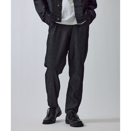 清涼感のある生地に加工をほどこし、デニムのような表情を持たせた軽さが特徴の素材。カジュアルな見た目ながら、軽やかで快適な穿き心地を実現しています。
