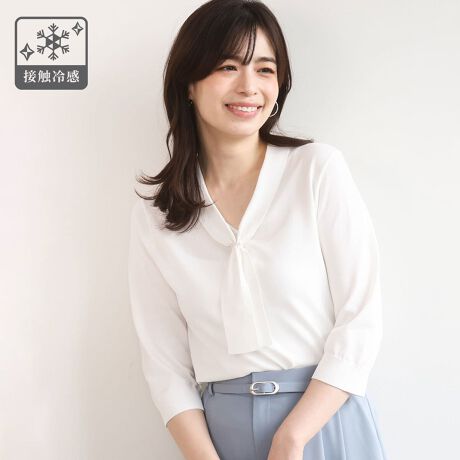 裾がリブ仕様になっているので、ボトムにインせずともバランスよく決まります。一枚で華やかに仕上がるボウタイデザインはジャケットを上から羽織ってもアクセントに。パンツあわせでもフェミニンな印象にまとまります。