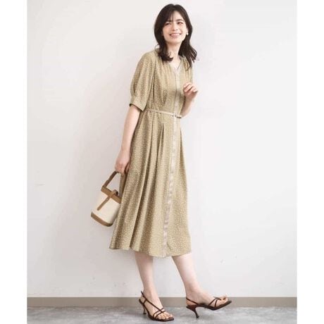 ペイント風ドット柄が程よい抜け感を演出するワンピース。襟から前立てにかけた異素材切り替えが縦ラインを強調し、すっきりとした印象に。ウエストのタックと同素材ベルトが程よいメリハリをプラスし、上品なシルエットに仕上げます。