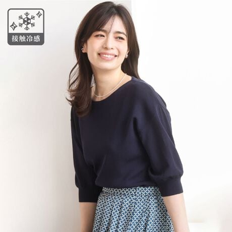 ハイゲージのきれいな目面が特徴のニット素材。お仕事などにもちょうどいい見え感でさらりとした肌触りの良さがポイント。厚すぎず薄すぎない程よい肉感で、端境期から夏、秋までロングシーズン活躍。 夏に嬉しい接触冷感機能付きです。