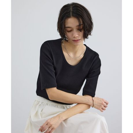 デコルテをヘルシーに見せる絶妙なUネックと、大人が着やすい袖丈設計が魅力です。