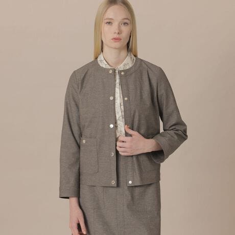メタルのドット釦がアクセントのノーカラージャケットです。裏地が無く、肌離れの良いサラッとした生地で春のワンピースの羽織として、またデニム合わせのカジュアルアップなスタイリングから、同素材のスカート(品番:G5S09739)、パンツ(品番:G5R10739)とのセットアップでも、さまざまなシーンで活躍します。