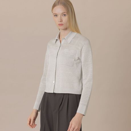ナチュラルな風合いが魅力の麻に極細のラメをプレーティングしほんのり肌が透ける涼しげなシャツニットです。シャツディテールのデザインできちんと感を演出しています。短めの着丈で、ボリュームのあるボトムともバランス良く合わせられ羽織としても活躍するアイテムです。