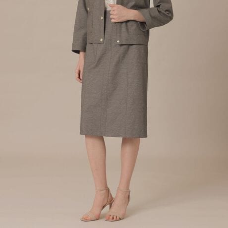 腰回りから裾に向けてスッキリとしたシルエットのスカートです。同素材のジャケット(品番:G5E10739)のフロントと同じディテールの前立てとタテの切替が細身に見せるシルエットです。ウエスト後ろはゴム仕様、裏地なしです。同素材のパンツ(品番:G5R10739)もご用意しております。