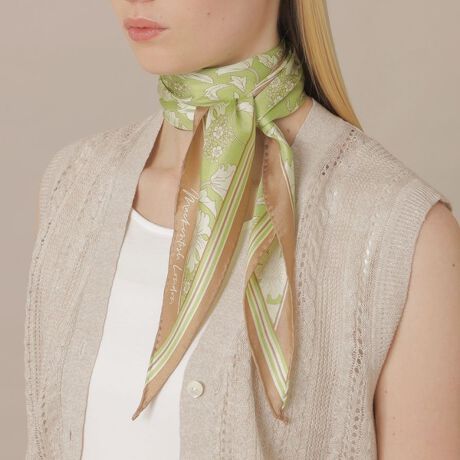 アイコンであるバイブリーフラワープリントのダイヤモンドシェイプスカーフです。定番サイズより一回り小さいサイズにしています。上品な光沢のある12匁シルクツイルを使用。首に1回結んで垂らしたり、二重巻にして短く結んだりとアレンジして着用いただけます。また、バッグや帽子に結んだり、ヘアアクセサリーとして髪に結んでも。熟練した職人が手捺染で丁寧にプリントしています。また、出来る職人がほぼいないとされるバイヤス地の手巻きを、職人が希少な技術で手巻したMADE IN JAPANのスカーフです。