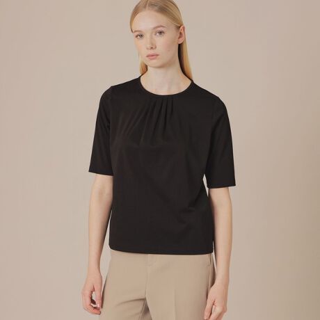 衿元にタックディテールをあしらったカットソーブラウスです。エレガントな装いに併せて着用しやすい様、衿周りは繊細な仕様でまとめ、1枚でもジャケットのインなどにも汎用性高くコーディネイトいただけます。同素材のタンクトップ(品番:G5P76765)もご用意しております。