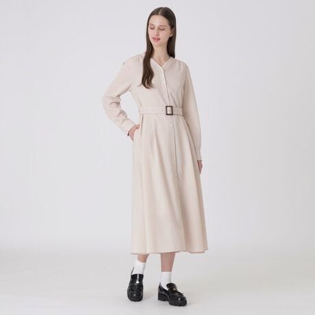 付属の太めウエストベルトにはトレンチバックルを採用しました。ウエストマークしてすっきり着こなすのはもちろん、ベルトを外して“羽織り”としても着用可能な着回し力のあるドレスです。
