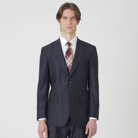 イタリアの老舗生地メーカー、LORO PIANA 社のネイビーマルチカラーチェックの生地を使用。原料はLORO PIANAの提携する オーストラリアの牧場から厳選されたメリノウールのみを使用して紡績されています。メリノウールは繊維が細く柔らかい為、肌ざわりの滑らかさが特徴です。生地レーベルの1つである「365」の生地を使用しており、シルクのような上品な光沢感や弾力性がありシルエットの美しさが際立ちます。遠目には無地に見えるような繊細な柄がビジネスシーンに洗練された印象を与えます。