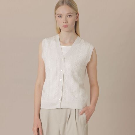 涼しげな透かし編みデザインが目を引く、上品で大人カジュアルなベストです。首周りはVネックに仕上げ、すっきりとしたバランスのデザインです。適度なゆとりのあるシルエットで、レイヤードのしやすさはもちろん、コーディネートにこなれ感をプラスしてくれるアイテムです。同素材のロングカーディガン(品番:G5N10714)もご用意しております。