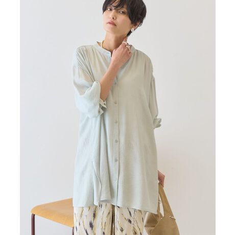 軽やかに揺れる楊柳素材の上品シャツ表面に凹凸のある楊柳素材が、さらりとした肌触りと涼やかな印象を与えてくれる一枚です。自然なシワ感が特徴で、アイロンいらずでもこなれた雰囲気を楽しめます。首元をすっきり見せてくれるバンドカラーは、きちんと感と抜け感を両立し、大人カジュアルな着こなしにぴったりです。ゆとりのあるシルエットで体のラインを拾いにくく、リラックスした着心地です。前を閉じて一枚で着るのはもちろん、タンクトップやカットソーの上から羽織りとしても活躍します。デニムやワイドパンツ、スカートとも合わせやすく、通勤から休日まで幅広いシーンで使える万能シャツです。透け感[ややあり]