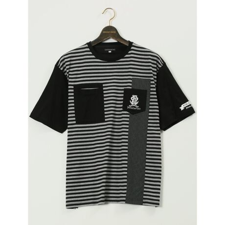コーディネートの主役になるクルーネックの半袖Tシャツです。ボーダー・無地・ドットを組み合わせた切り替えデザイン、ブランドのアイコンでもあるモノグラムKUMAの刺繍、両胸のポケットがポイント。「ちょい派手」をイメージした遊び心あるデザインで存在感たっぷりに仕上げています。