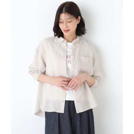 human womanらしい台襟付き小さめシャツカラーのブラウスです。肌離れ感あるボックスシルエットの全開き仕様なので羽織りとしても着まわせます。袖口はカフス仕様なのでロールアップしてもニュアンスある、洗いざらした麻の清涼感ある心地良さを感じるトップスです。