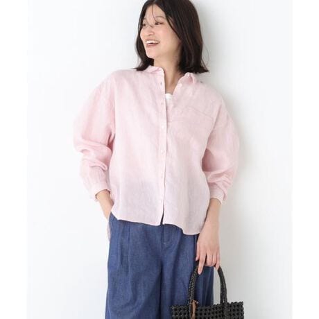human womanらしい台襟付き小さめシャツカラーのブラウスです。肌離れ感あるボックスシルエットの全開き仕様なので羽織りとしても着まわせます。袖口はカフス仕様なのでロールアップしてもニュアンスある、洗いざらした麻の清涼感ある心地良さを感じるトップスです。