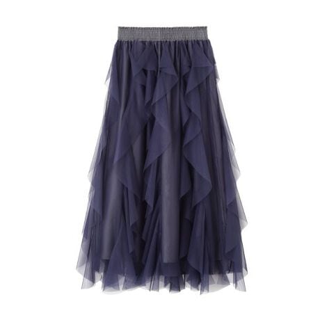 チュールとレース素材を縦に施したラッフルデザインが印象的なシアースカート。縦ラインのラッフルデザインですっきりとしたシルエットを演出します。軽やかな透け感で女性らしい抜け感をプラスし、歩くたびに揺れる華やかさが魅力。デイリーからお出かけまで幅広く活躍してくれます。※撮影時照明の関係により、色味が違って見える場合がございます。またパソコン・スマートフォンなどの環境により、若干製品と画像のカラーが異なる場合もございます。予めご了承ください。商品の色味は、商品単品画像をご参照下さい。※商品画像はサンプルのため、色味やサイズ等の仕様に変更がある場合がございますので、予めご了承ください。
