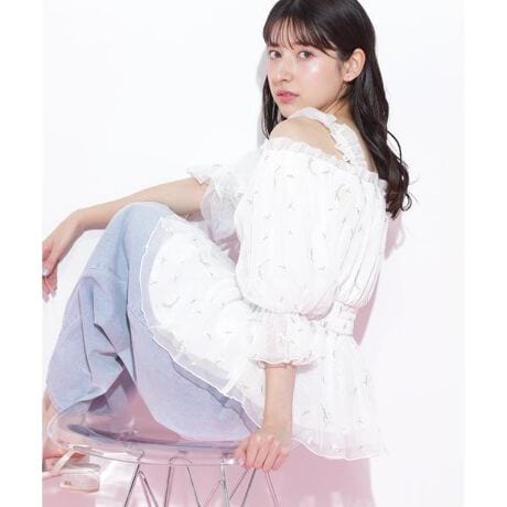 小花柄刺しゅうとチュールを組み合わせた華やかトップス。取り外し可能なギャザーフリルの肩紐で鮮度アップするデザイン。インナーの肩紐が隠れるので安心して着こなせます。レディムード抜群なデコルテ見せでヘルシーなコーディネートを楽しめます。※撮影時照明の関係により、色味が違って見える場合がございます。またパソコン・スマートフォンなどの環境により、若干製品と画像のカラーが異なる場合もございます。予めご了承ください。商品の色味は、商品単品画像をご参照下さい。※商品画像はサンプルのため、色味やサイズ等の仕様に変更がある場合がございますので、予めご了承ください。