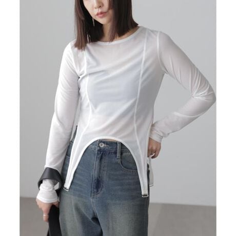 今年らしいガーターデザインのインナーカットソー。秋口はトップスとして、冬にかけてはニットのインナーに取り入れてレイヤードを楽しめます。身頃はボディラインを縦に強調してくれるピンタック入り。ルーズなデニムやミニスカートとのスタイリングがおススメです。裾脇を短めの丈にしているので、腰がチラ見えしてヘルシーな肌見せトレンドも叶います。※モデルの着用画像の場合、光の当たり具合により、実際の色味と異なって見えることがございます。色味は、商品単体の画像をご参照ください。
